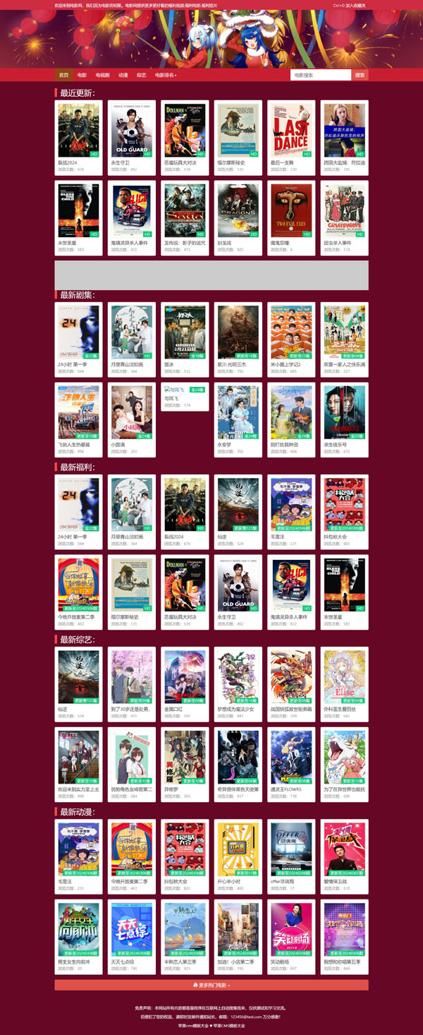 这款模板是应站长要求,专门为动漫站设计,采用了热情似火红色影视风格,并加入了动漫元素,特别适用于动漫站,当然影视站也完全没有问题。网络上有该模板的老版本,只是老版本过于陈旧,已进行了图片及代码优化处理,可显著提高浏览速度,并增加了首页移动端适配,以满足现在的做站需要!