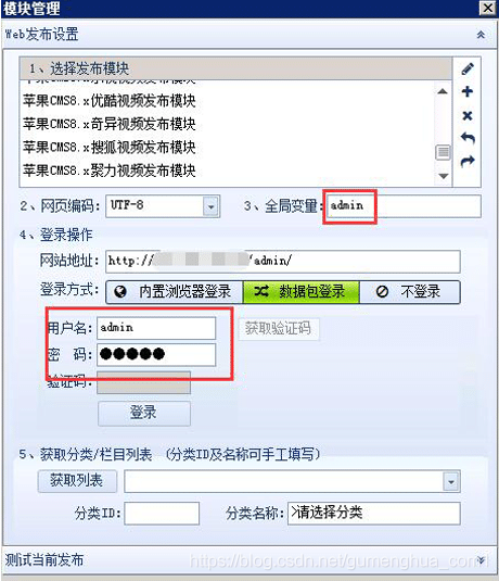 在1、选择发布模块的部分找到刚才保存的发布模块,如上图填写相关内容,这里说下全局变量,就是在登录苹果CMS后台时的安全码,另外接口可能需要根据自己的实际情况经行修改。