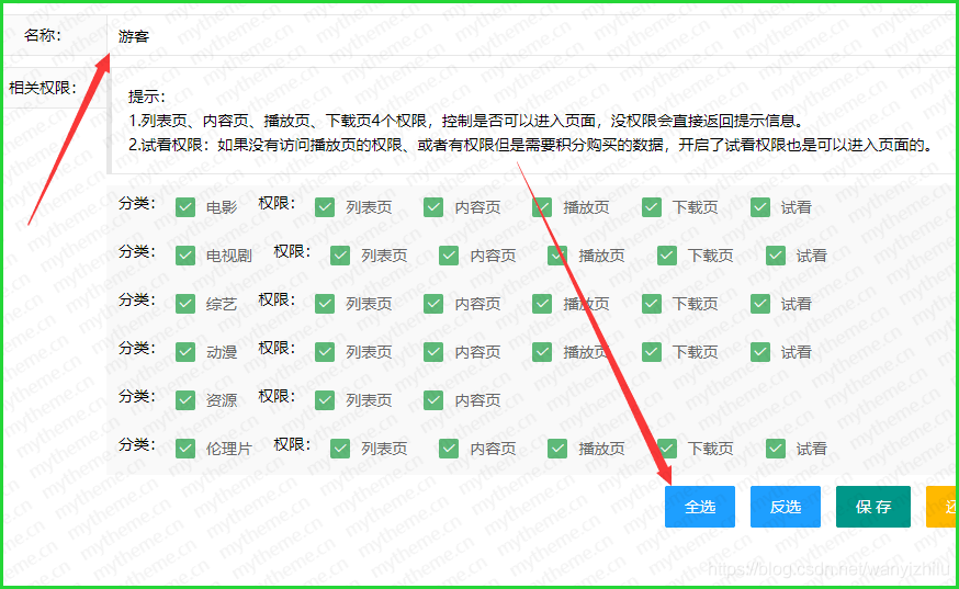 苹果cms提示没有权限解决方法 作者: • 更新时间:2025-11-18 00:00:00 •阅读 1,提示权限不足这种情况是苹果cms新添加了分类,但是没有修改权限造成的。 2,解决办法:找到用户>>会员组>游客>编辑 3,修改游客权限,全部勾选后保存 本文由发布,不代表苹果CMS模板网立场,转载联系作者并注明出处:/Macjc/1107.html