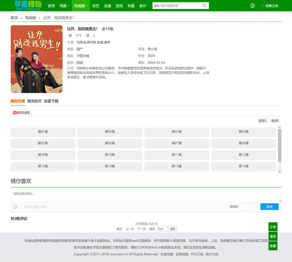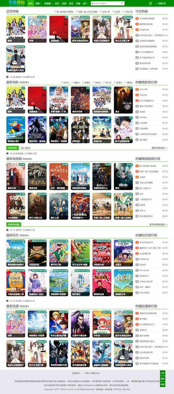 如果你看腻了,传统黑白灰色调,这款小清新绿色简约经典风影视网站,或许能够让你眼前一亮。这款模板摈弃了复杂js效果,只保留了经典影视网站布局,既然左右栏设计,中规中矩的设计不会翻车,再配合绿色小清新的画风,绝对是一款不可多得模板。整套模板压缩后不到1Mb,只有520kb大小,访页面加载速度极快!