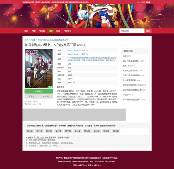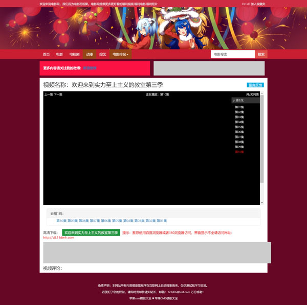 这款模板是应站长要求,专门为动漫站设计,采用了热情似火红色影视风格,并加入了动漫元素,特别适用于动漫站,当然影视站也完全没有问题。网络上有该模板的老版本,只是老版本过于陈旧,已进行了图片及代码优化处理,可显著提高浏览速度,并增加了首页移动端适配,以满足现在的做站需要!