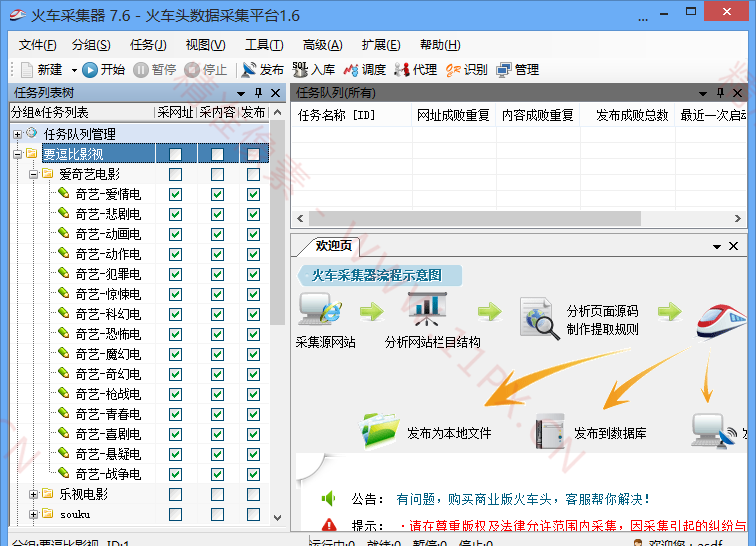 添加网站发布配置,然后双击、弹出一个弹窗,点击获取列表,稍等一会 点右边的小倒三角,采集什么分类就选择什么分类、比如我采集爱情电影,对应后台选择爱情片、选择好之后,我们点添加、点击添加之后、相对于的分类已经添加好了,点下方的保存,保存好了,转到主界面,在规则后面的三个框一定要 全部打钩 全部打钩 全部打钩 重要的事情说三遍!!全部打钩之后,我们点上方的开始后它会自动分析、分析好了之后,软件会自动采集、等采集好了,软件就开始自动发布了、软件开始发布的时候 你可以去后台看,视频是不是添加了,没有添加的话检查后台站外入库是否对齐,还有密码!