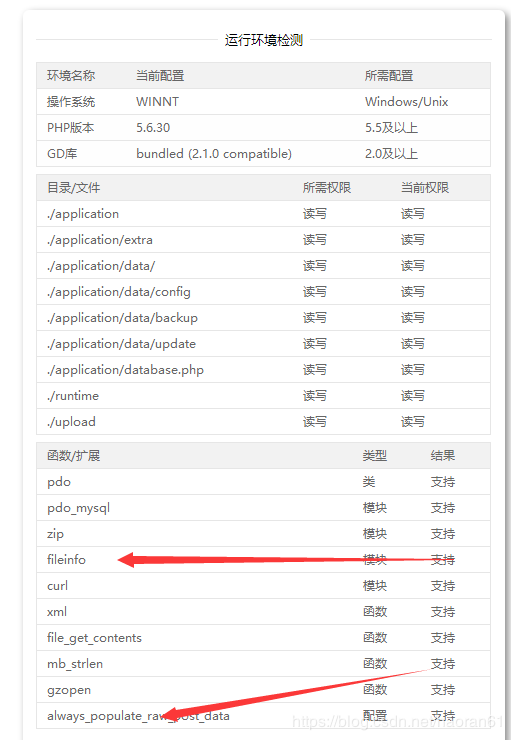 箭头指向的两个地方,大部分人都会报错(我的没有报错是因为我装过N次了,配置文件已经改过了),说不支持,这里我们只需要进入php5.6的安装目录(护卫神的安装目录下面phpwec里面,找到php5.6的文件夹)打开配置文件(php.ini),alt+F 搜索这两个插件的名字,这时候你会看到前面会带注释符,我们把注释符删掉即可,然后进行下一步。