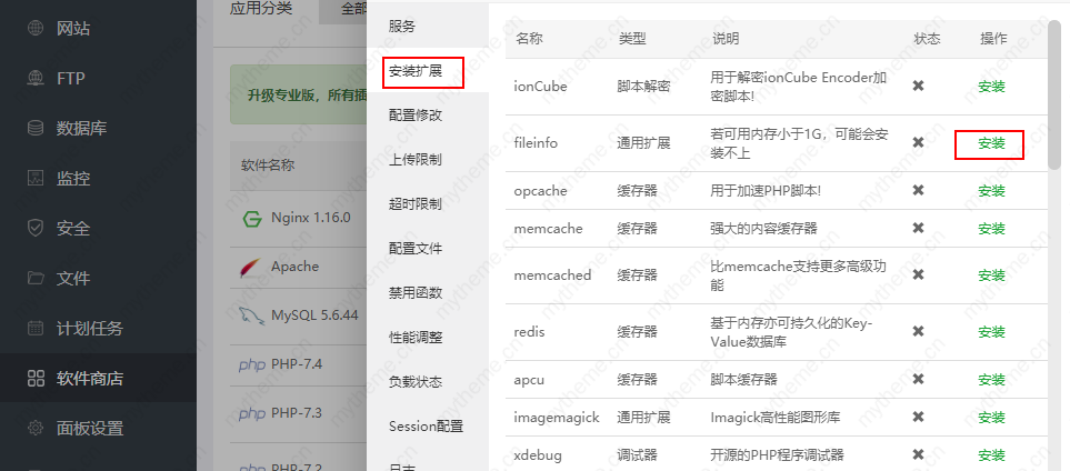 在弹出的页面中选择安装扩展----找到fileinfo-----点击安装。在此项目上我们也可到提示:若可用内存小于1G,可能会安装不上,如果安装不上就按照我们上面的办法来解决。请按实际需求安装扩展,不要安装不必要的PHP扩展,这会影响PHP执行效率,甚至出现异常。