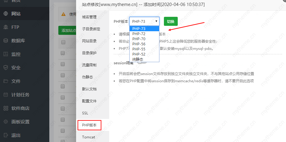 找到我们的站点--设置---会弹出下面的页面,然后切换下php版本即可。推荐7.0+