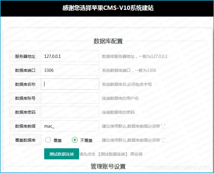 6、填写数据库配置,管理账号信息