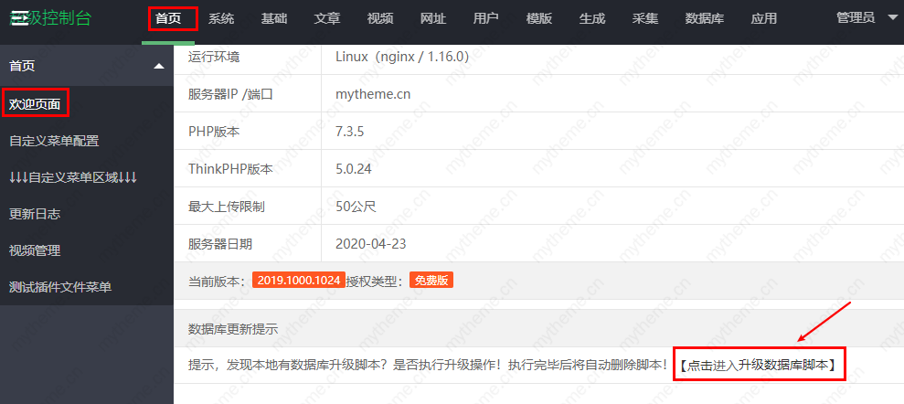 下载升级包后,和第一次上传安装同样的步骤,只是登录后台管理后需要升级下数据库如下图所示,如果你是新安装可参考文档:苹果cms安装教程(完整版)来进行安装。