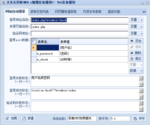 在1、选择发布模块的部分找到刚才保存的发布模块,如上图填写相关内容,这里说下全局变量,就是在登录苹果CMS后台时的安全码,另外接口可能需要根据自己的实际情况经行修改。