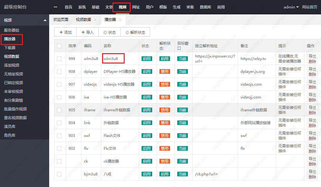 第四步,(视频>>播放器 )寻找下我们是否成功添加了wlm3u8编码的播放器。如果我们添加了播放器还是不能播放,首先清理下缓存最好是换个浏览器再来测试下。