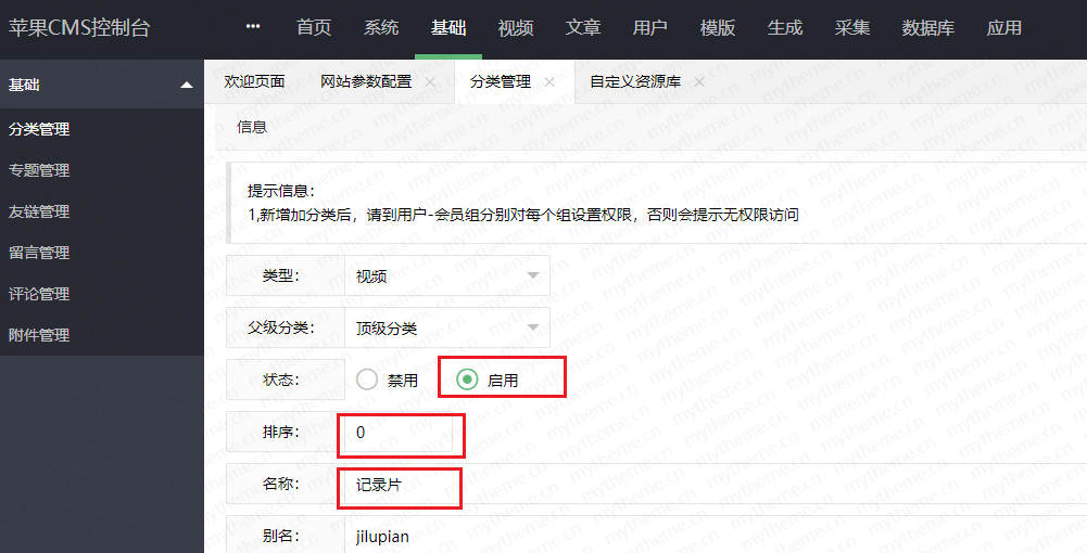 1.首先进入后台 ,按顺序依次点击 基础>>>分类管理>>>添加