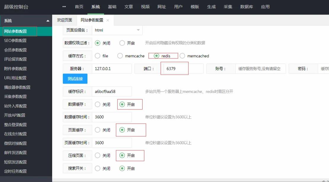 4,进入苹果cms后台,网站参数设置-性能优化,缓存方式设置为Redis,IP:127.0.0.1端口:6379然后测试连接 连接成功代表能正常使用该缓存,然后开启:数据缓存/页面缓存(如下图)