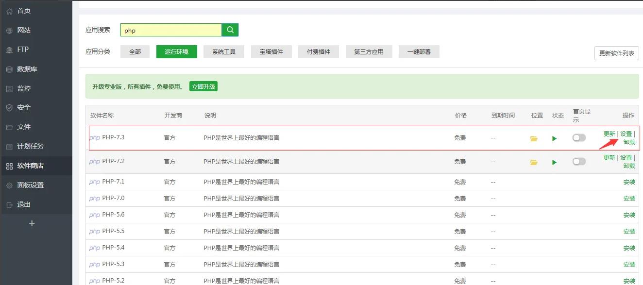 2,然后再找到你的网站环境所使用的PHP版本点击设置。