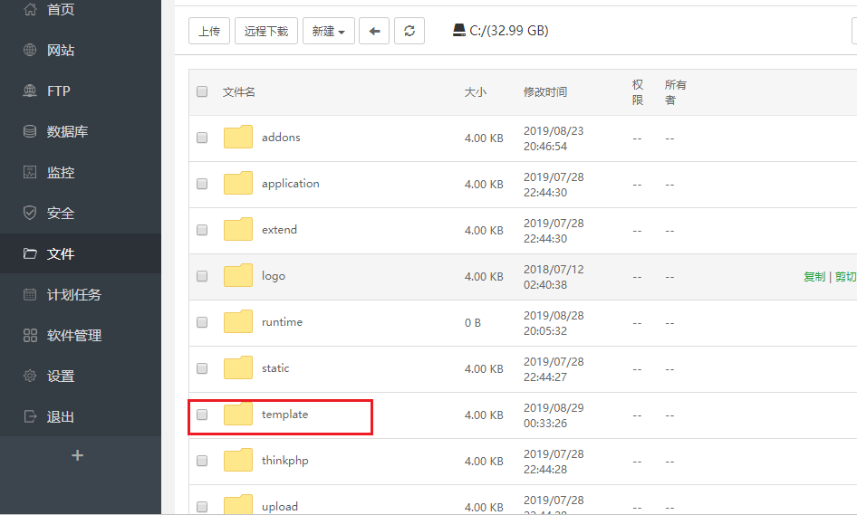 2,有了模板后我们就开始上传模板到我们的网站上,我建站用的是宝塔 下面截图的是宝塔上网站模板所要存放的位置,但是无论你用什么建站的,存放模板目录不会改变来到网站根目录找到“template”这个文件夹