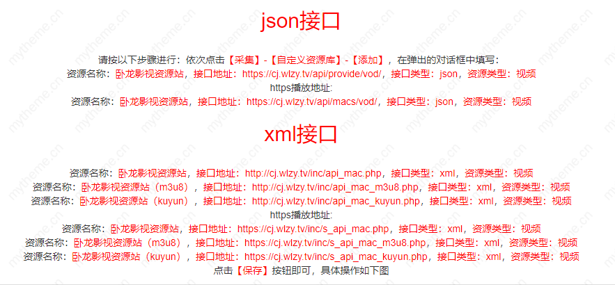 下面是某个资源站提供的苹果cms采集接口,【json】接口和【xm|】接口两种接口,这两个接口又分【http】和【https】所以在添加采集的时候要结合自己的网站把【http】和【https】区分开来,否则即使添加对应的播放器后也不会播放的。