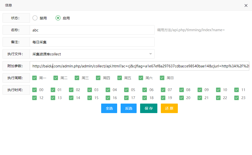 4,状态选为: 启用,名称和备注:可任写,附加参数:粘贴刚刚复制的链接,执行周期和执行时间的设置点击下面的全选按钮即可。