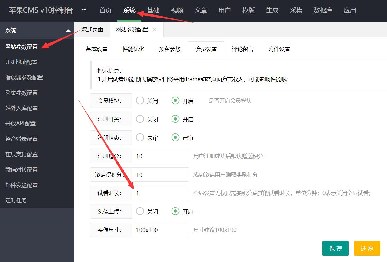 实例演示:对游客开启试看1分钟:第一步:在后台的系统>网站参数配置>试看时长>设置为1