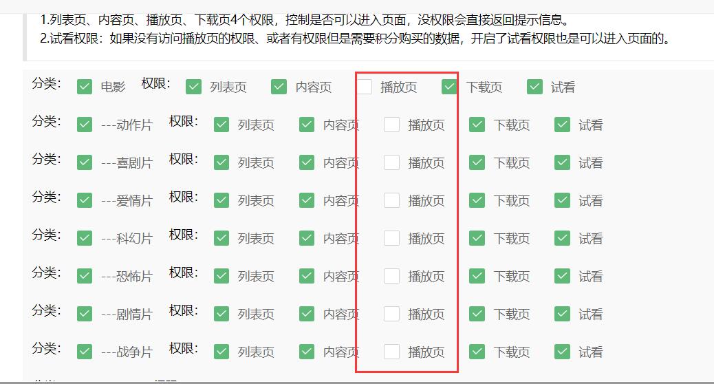可根据分类单独配置试看权限,我这里是全站数据都对游客开启试看,所以把所有分类的播放页勾去掉了,剩下的全打勾,点击保存设置,这样试看功能就配置成功了。