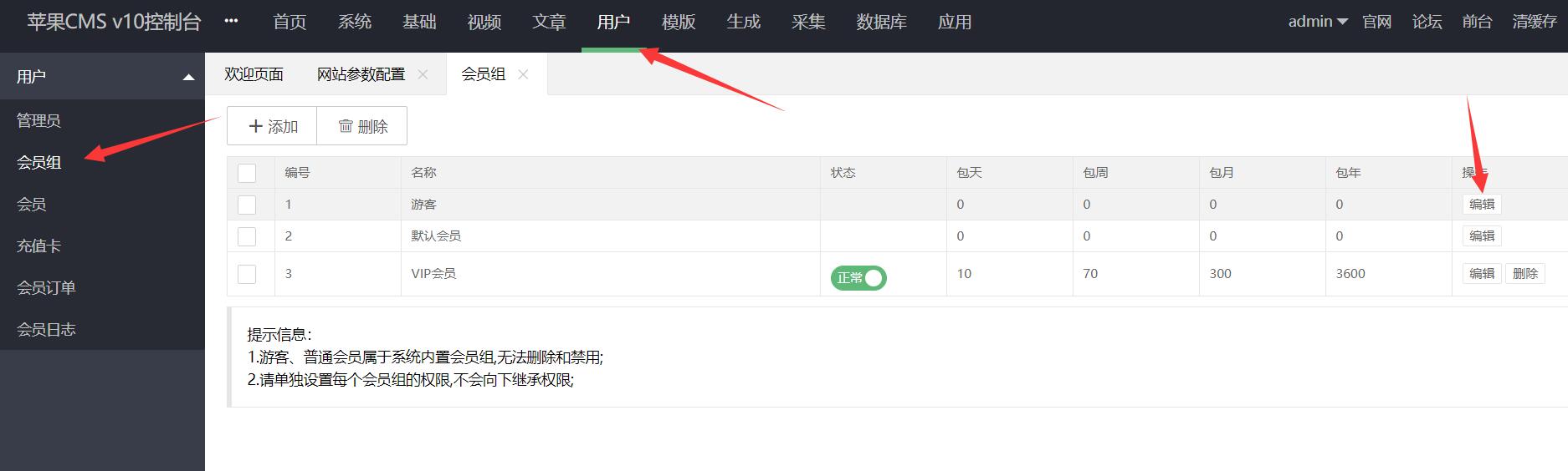 如果你需要对vip用户开启播放全片权限,只需要对vip用户组的权限全部打钩就ok了。