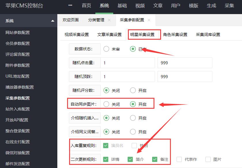 后台找到“系统”、“采集参数配置”,视频采集设置,然后安装图中所示设置,主要开启自动同步图片、入库重复规则勾选上分类,二次更新规则勾选上播放地址、下载地址和备注;其他不用勾选,然后保存即可。