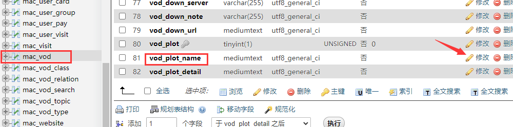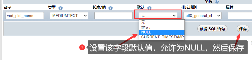 2、在数据库中,找到该数据表,找到该字段,修改默认值,允许为空;一般采集遇到的提示,都是在 mac_vod 数据表中去查找响应的字段