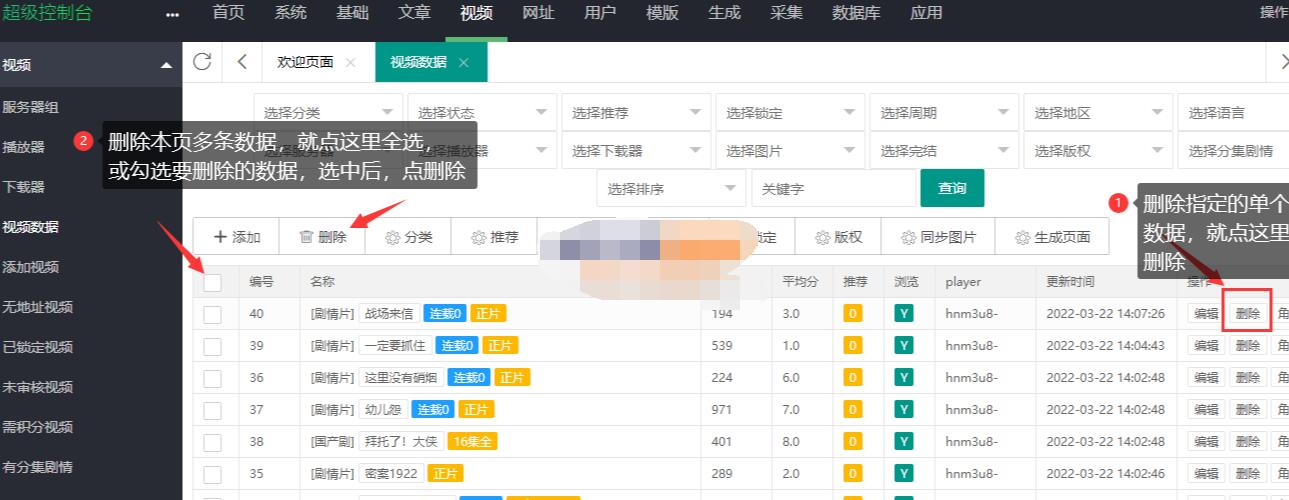 苹果cmsv10如何删除数据 作者: • 更新时间:2025-11-18 00:00:00 •阅读 苹果cmsv10删除数据有以下几种方式:1、通过sql语句,清空视频数据 2、删除单个视频,或选择批量删除 3、删除某个资源站数据,一般每个资源站都有独立的播放标识,如若要删除某个资源站的数据,则删除对应的播放组即可 上面的删除方法使用后,会出现部分数据为空的播放组,最后再删除一遍空播放组即可4、以此类推,你想怎么批量删除,设置好删除条件,点击批量删除即可 本文由发布,不代表苹果CMS模板网立场,转载联系作者并注明出处:/Macjc/836.html