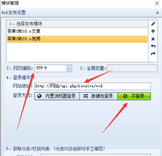 4、修改采集规则,配置发布模块最关键的一步,也是很多人出错或是甚至弄不懂的地方。我用箭头所指向的地方就是我们要配置的地方。如下图