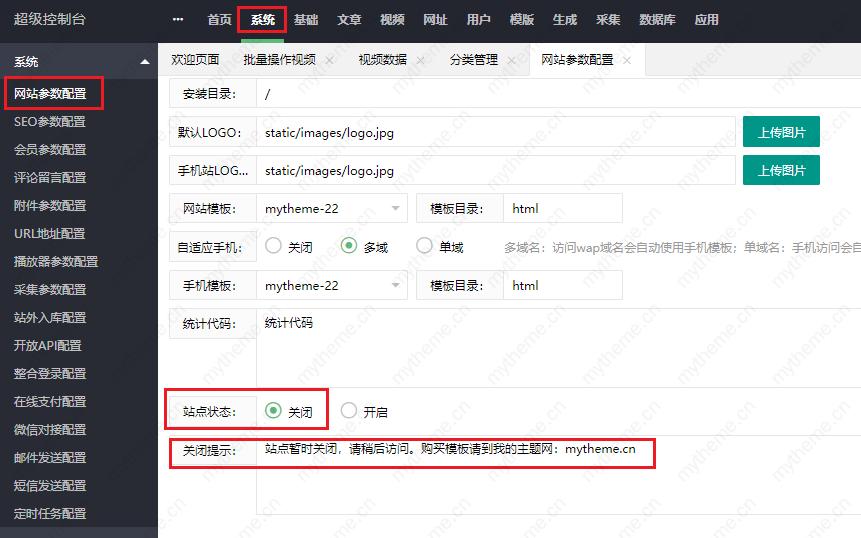 苹果CMS设置网站临时关闭维护方法 作者: • 更新时间:2025-11-18 00:00:00 •阅读 网站难免有时候需要暂停维护下,苹果CMS后台自带这种非常友好的网站临时关闭的提示功能。 我们只需要登录后台-系统-网站参数配置-基本设置-站点状态关闭-关闭提示(填写自己想要显示的文字)。 本文由发布,不代表苹果CMS模板网立场,转载联系作者并注明出处:/Macjc/857.html