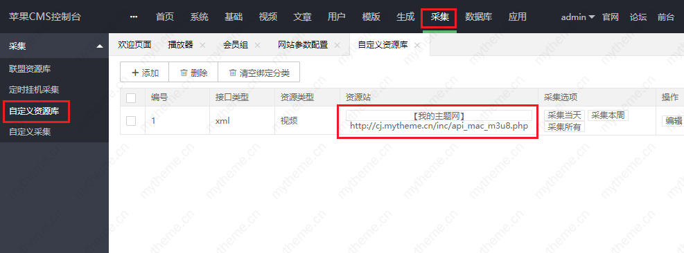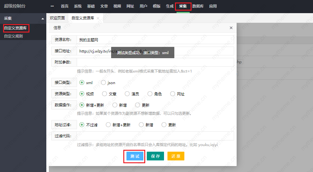 1,今天教大家怎么添加采集自定义资源库;进入后台我们随便以某资源站为例,接口可以到你要采集的网站上获取就可以了 一般都在网站的帮助中心:添加方法如下图(添加后进行测试不成功需要填写附加参数 &ct=1)