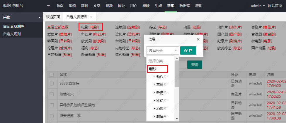 3,添加资源接口成功后需要对资源进行分类绑定 :点击高清资源链接进入绑定页面进行分类绑定