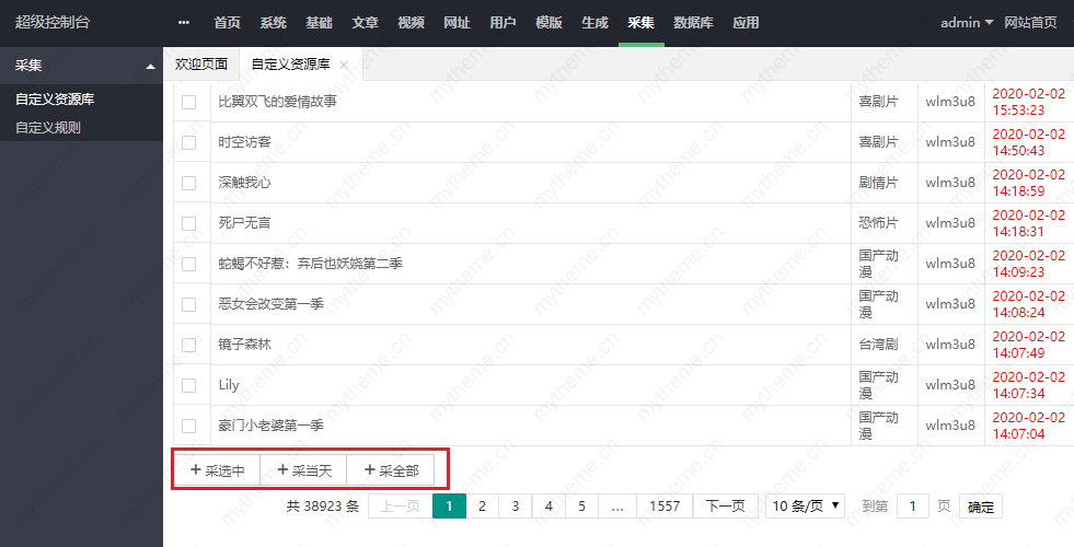 5,绑定后剩下就是采集了 拉到页面的底部 有采集按钮 可以采集当天 采集选中(在需要采集的视频前面打勾)还有采集全部三种选择